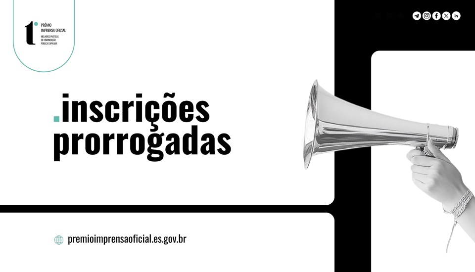 Atenção, comunicadores! O prazo de inscrições para o "1º Prêmio da Imprensa Oficial – Melhores Práticas de Comunicação Pública Capixaba" foi prorrogado. Agora, os interessados terão até a próxima segunda-feira (31) para garantir sua participação na premiação que reconhece as melhores estratégias de comunicação adotadas pelos órgãos dos Três Poderes estaduais – Executivo, Legislativo e Judiciário.