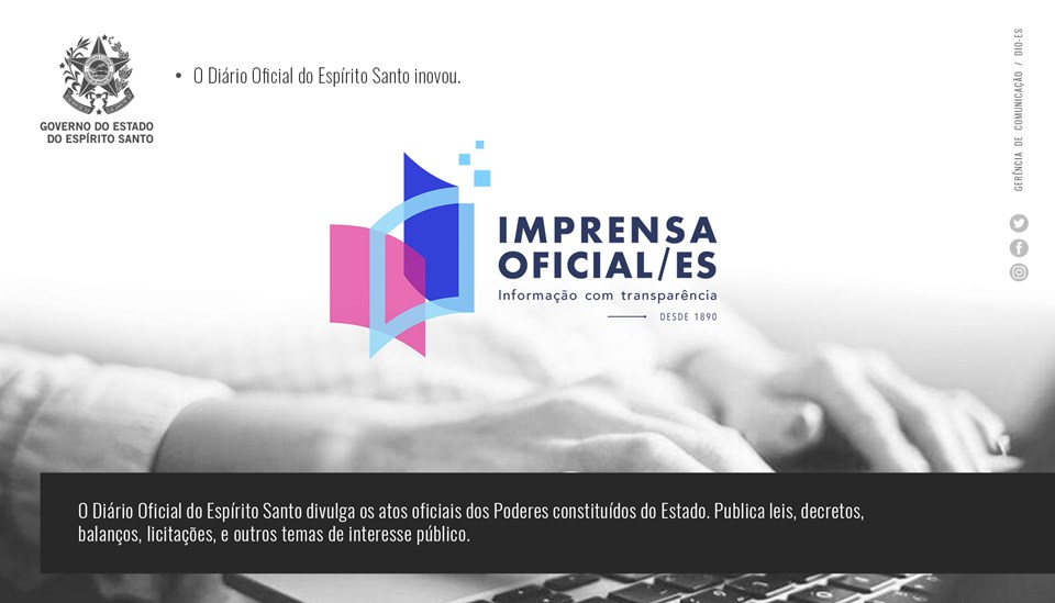 Na segunda-feira (23), também foi lançada a edição especial apresentando ao público a nova marca do Departamento de Imprensa Oficial do Espírito Santo e o novo layout do Diário Oficial do Estado. Em função do feriado estadual da Colonização do Solo Espírito-santense, a publicação do Diário foi produzida de forma excepcional.