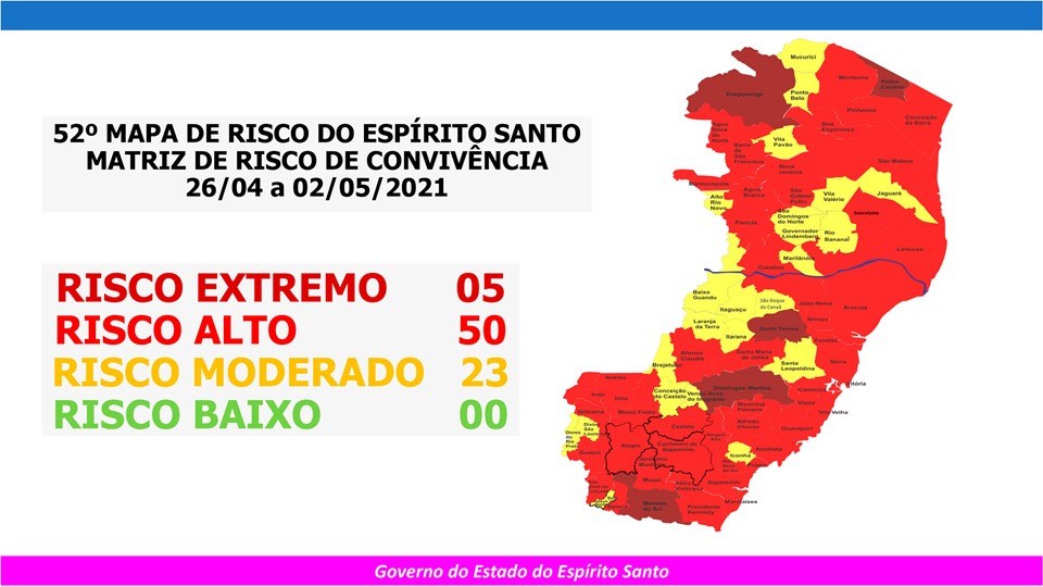 O Governo do Estado anunciou, na sexta-feira (23/04), o 52º Mapa de Risco Covid-19, que terá vigência de segunda-feira (26/04) até o próximo domingo (02/05). Dos 78 municípios capixabas, 50 estão classificados em Risco Alto e 23 em Risco Moderado. Cinco municípios (Domingos Martins, Ecoporanga, Mimoso do Sul, Pedro Canário e Santa Teresa) seguem em Risco Extremo. Não há municípios classificados em Risco Baixo.