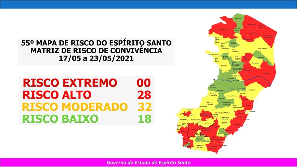 O Governo do Estado anunciou, na última sexta-feira (14), o 55º Mapa de Risco Covid-19, com vigência de segunda-feira (17/05) até o próximo domingo (23/05). Dos 78 municípios capixabas, 18 estão classificados em Risco Baixo, 32 em Risco Moderado e outros 28 em Risco Alto. Com o fim da regra da conurbação dos municípios da Grande Vitória, a classificação dos municípios passa a ser feita de forma individual.