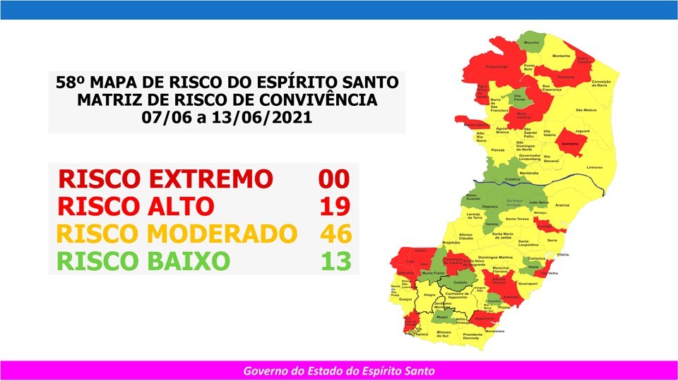 O Governo do Estado anunciou, na sexta-feira (4/6), o 58º Mapa de Risco Covid-19, que terá vigência de segunda-feira (7/6) até o próximo domingo (13/6). Dos 78 municípios capixabas, 13 estão classificados em Risco Baixo, 46 em Risco Moderado e outros 19 em Risco Alto.