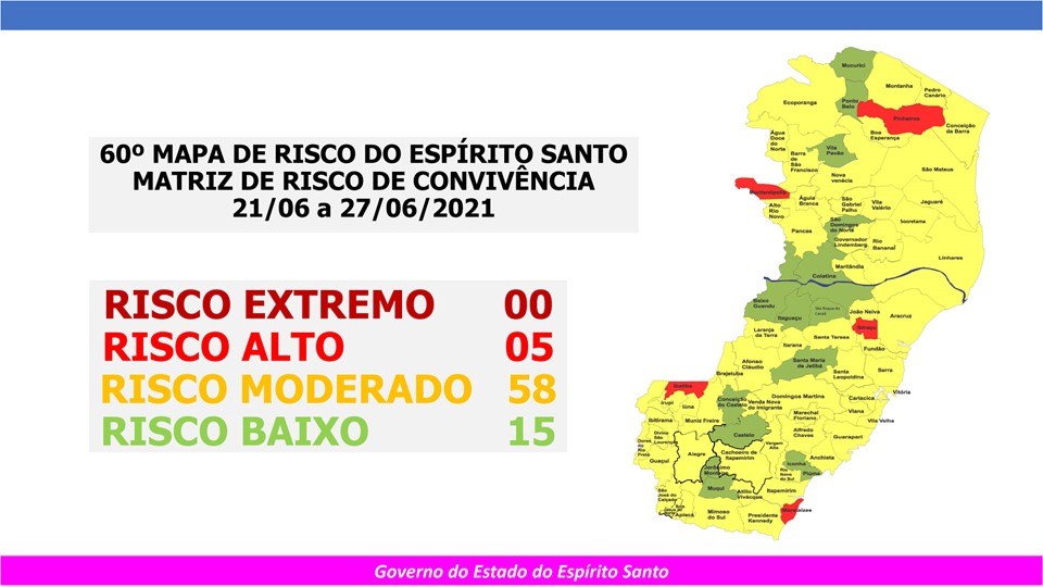 O Governo do Estado anunciou, na última sexta-feira (18), o 60º Mapa de Risco Covid-19, que terá vigência de segunda-feira (21/06) até o próximo domingo (27/06). Dos 78 municípios capixabas, 15 estão classificados em Risco Baixo, 58 em Risco Moderado e cinco em Risco Alto.