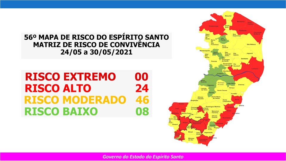 O Governo do Estado anunciou, na sexta-feira (21/05), o 56º Mapa de Risco Covid-19, que terá vigência desta segunda-feira (24/05) até o próximo domingo (30/05). Dos 78 municípios capixabas, oito estão classificados em Risco Baixo, 46 em Risco Moderado e outros 24 em Risco Alto.